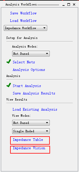 (6) 点击Start Analysis按钮就可以开始对选择的网络进行阻抗分析。等待分析的进度条完成以后,就可以查看分析完成的结果。分析的结果两种显示方式,一种是表格的方式显示出来,一种是色度图表的方式显示出来。选择Impedance Table按钮可以开启分析结果的表格显示方式。