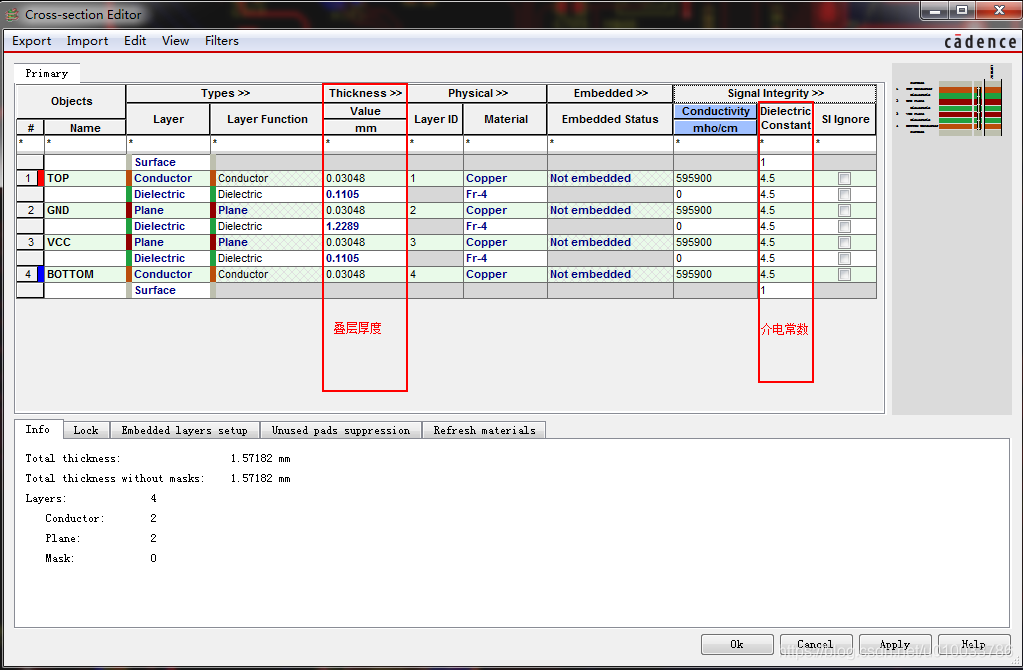 (2)选取电路板4层的叠层情况如下,从下图中我们可以看出,这是一个4层电路板,厚度是1.6mm。其中GND层,VCC层是阻抗线的参考层。