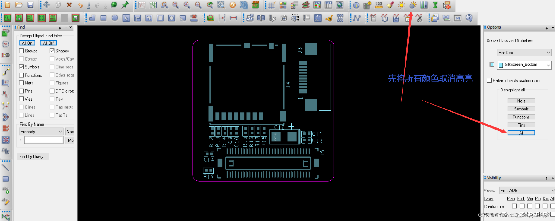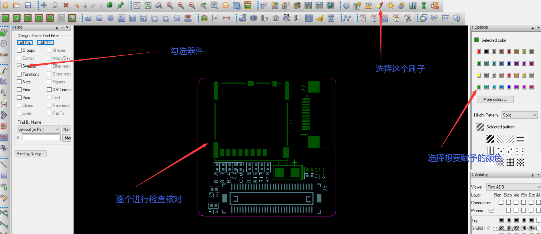 Allegro中,在将丝印调整好后,要做进一步检查,防止某个器件的丝印未调整,此时可以采用如下操作;
