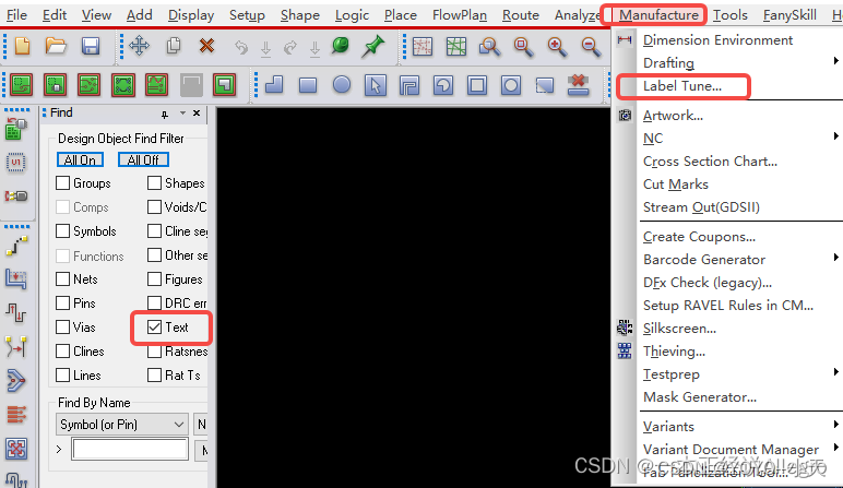 Find栏勾选“Text”, 菜单栏 点击Manufacture,在下拉栏选择“Label Tune”;