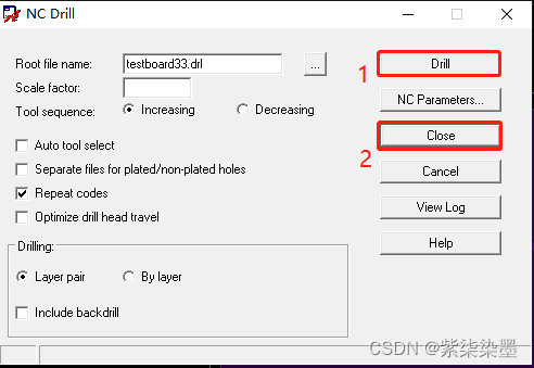 2、 软件 弹出NC Drill对话框后,设置如下图所示,点击Drill按钮输出钻孔文件,点击close进行·。