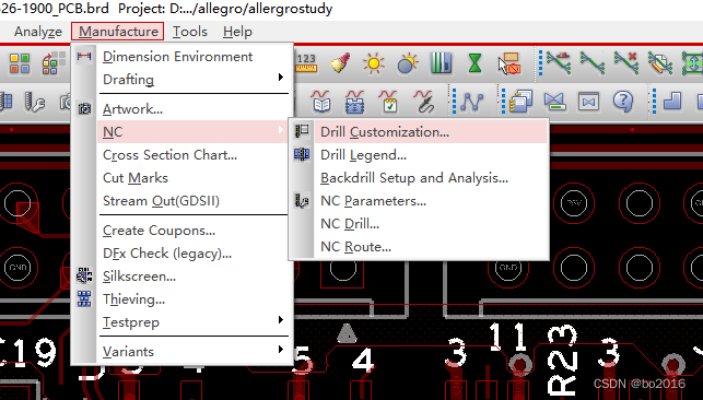 1、首先要提取钻孔表,manufacture--->NC--->Drillcustomization第一步如下图所示: