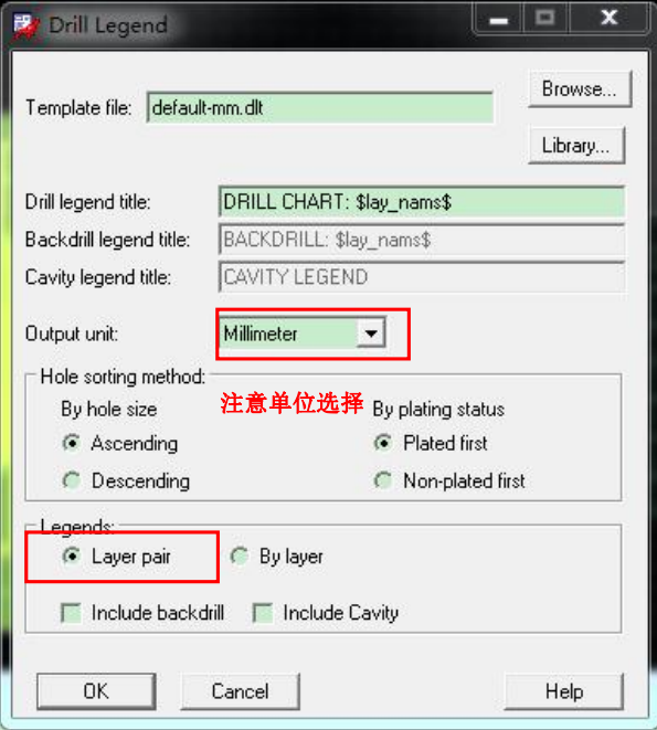 4.钻孔表及钻孔图的生成:执行 Manufacture → NC → Drill Legend,如果 有盲孔或埋孔,则 Drilling 中选择 By Layer,否则默认(单位为 mil),点击 OK 生 成*.dlt 文件。
