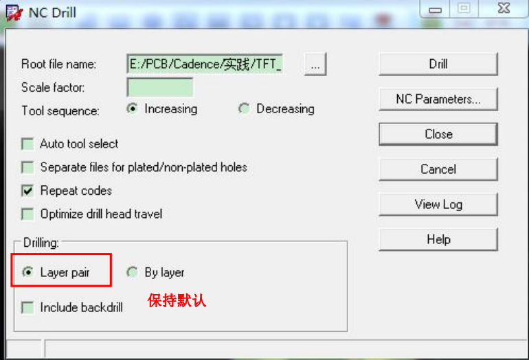 2.执行 Manufacture → NC → NC Drill,如果有盲孔或埋孔,则 Drilling 中 选择 By Layer,否则默认,点 Drill 生成*.drl 文件,点击 Viewlog 可以查看日志 信息。