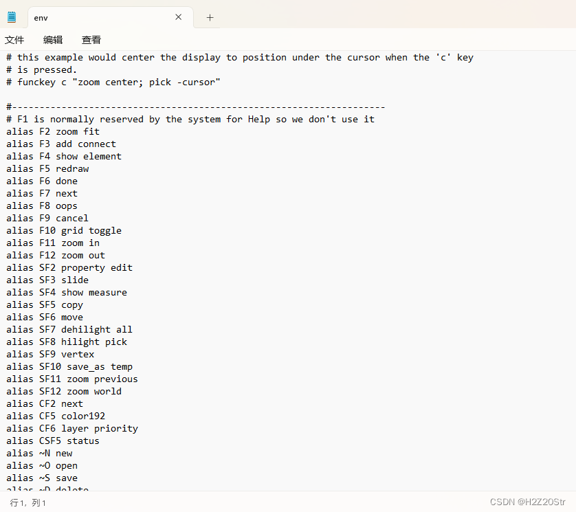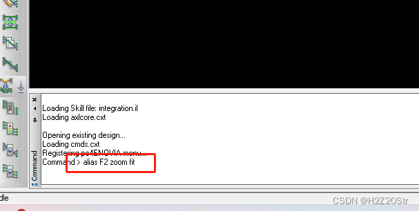 其中的alias F2 zoom fit 就是快捷键方式,可以将F2改成自己想要的快捷键,此外还可以自行添加快捷键,但要根据 alias (快捷键)(操作)这个的格式进行添加