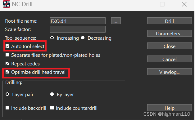 上面已经生成了钻孔表格,现在点击manufacture-NC-NC_drill,按下图勾选: