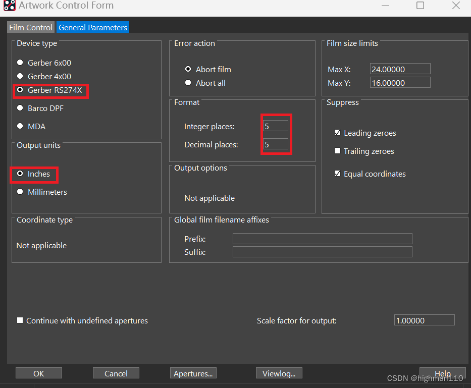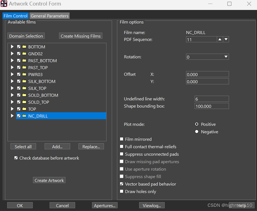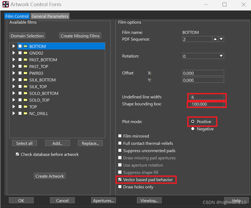 1.2输出文件Manufacture-artwork,设置导出光绘的参数:没有定义的线宽设置为6、负片层anti-etch外扩的大小设置为100、走线层选正片、平面层选负片、再勾选倒数第二个框,所有层都按此设置一遍。
