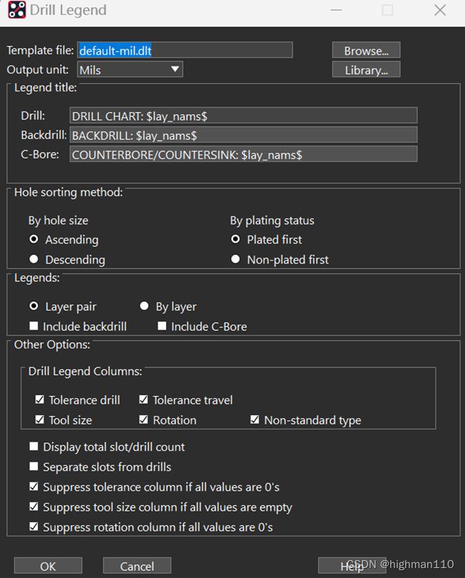 在添加钻孔层前,需要先 提取 钻孔文件。Manufacture-NC-drill legend,可以使用默认设置直接点击OK,也可以勾选显示总过孔数量和区分槽孔和过孔。