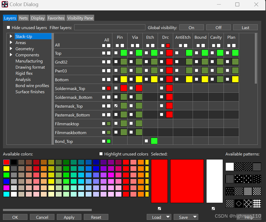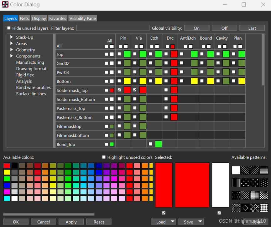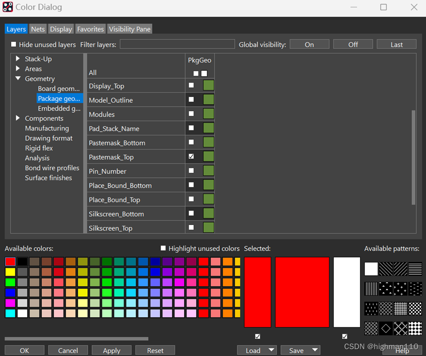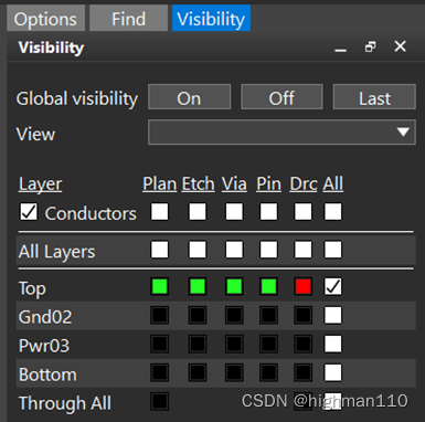 同样,在颜色管理器中只打开板框和所有阻焊层,包括stack-up中的pin、via的阻焊、package geometry和board geometry里的阻焊,同时visibility里什么都不要勾选: