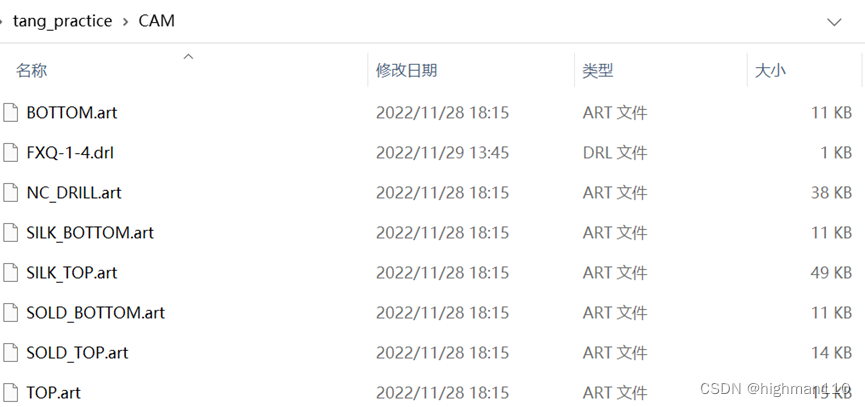 新建 CAM (制板光绘文件,钻孔文件,不包含钢网层光绘)、SMT(钢网层光绘、坐标文件)、PCB(PCB brd文件)文件夹,将相关文件放置在文件夹下。