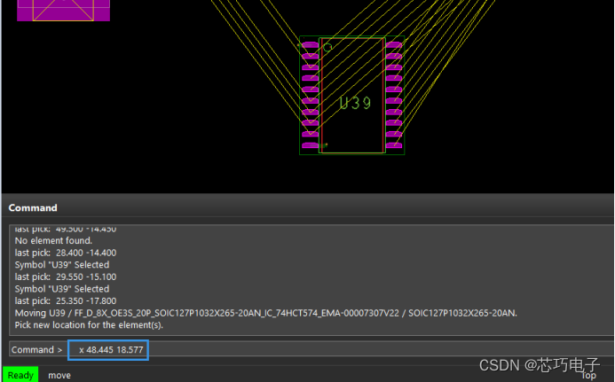 步骤四:鼠标拾起器件后,点击Command栏,输入要将器件移动到的位置坐标,我们以48.445 18.577为例,命令格式为x 48.445 18.577或者x 48.445 y 18.577,如图6所示。