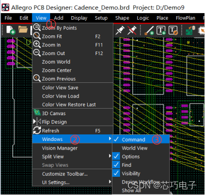 如果Allegro PCB软件界面没有显示Command窗口,我们可以通过点击View-Windows-Command来将其打开,如图7所示。