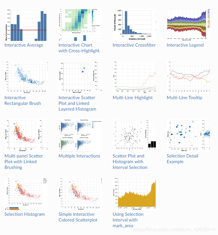 这里你只需要指定数据列以及颜色的编码比如指定图表的x轴、y轴所对应的数据列及数据点的颜色编码,其余的 绘图 工作Altair会自动帮你完成。下面是的截图是官方文档中提供的一些例子: