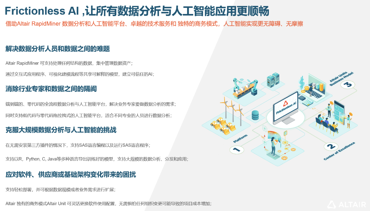 作为全球计算科学和人工智能领域的领导者 Altair,全新数据分析与人工智能平台 Altair RapidMiner。此次启动仪式以 “ 数据科学 ,解码智能未来” 为主题。目的是为了更好的助力本土用户推进高效数字化转型,实现数据分析与人工智能应用的降本增效.