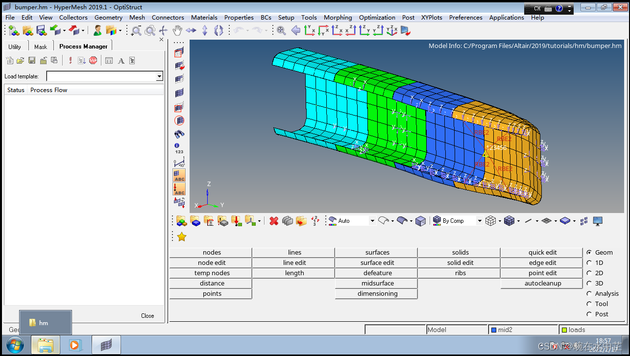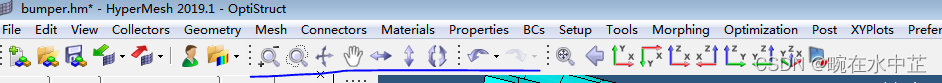 1)点击菜单栏 "File->open",在open model弹框中找到C:\Program Files\Altair\2019\tutorials\hm,我们这次导入bumper.hm模型,点击打开按钮后可导入到环境中。