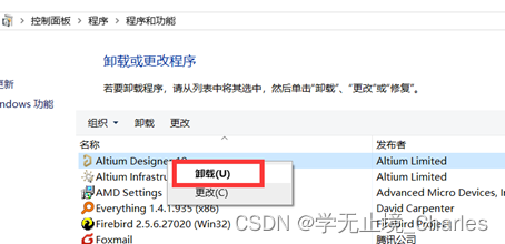 在电脑控制面板找到对应的Altium Designer软件程序,鼠标右键选择卸载,如下: