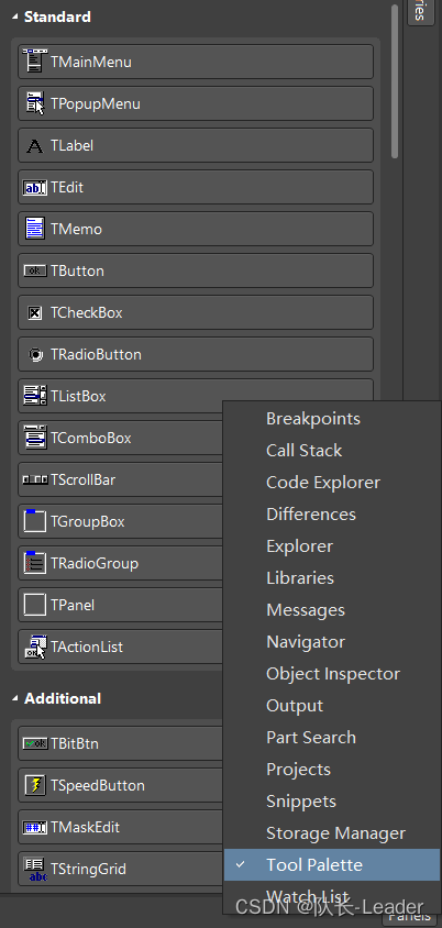 在右下角Panels,打开Tool Palette,可以看到一些控件,拖动控件到Form中,即可使用。