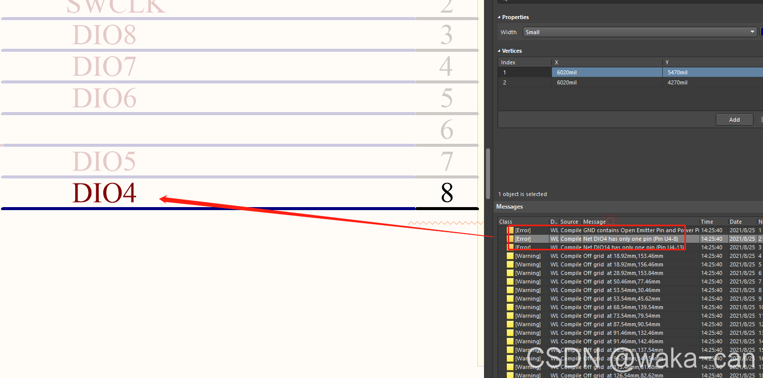 编译原理图共工程,出现如下图所示错误,链接中说的其实已经非常明白了,就是,而引起的错误。正常情况,网络直接都是点对点,至少要两个起步的,但是现在只有一个出头,没有另一个端,自然会出现这个错误。