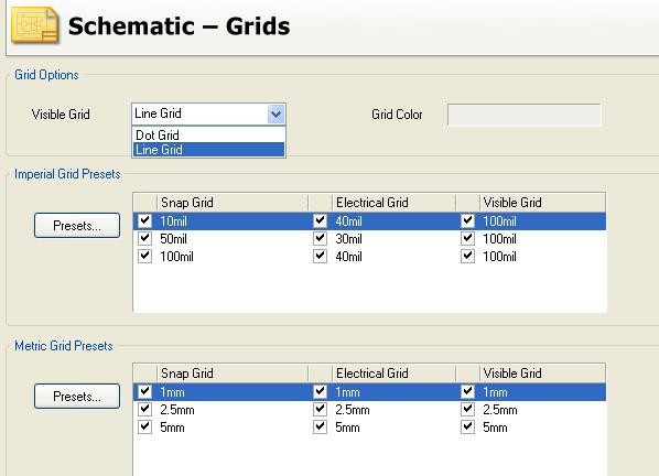 Grid Options 设置是在原理中的显示方式,在打印时选用 Dot格式的,平时选用Line格式,同时在放置元件的时候,要保障你所放置的元件电气管脚在点栅格的点上,NET 放置也是如此,否则会出现原理图中的线在 PCB 环境中并没有连接。