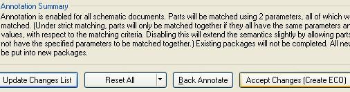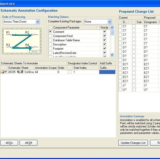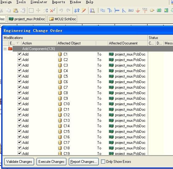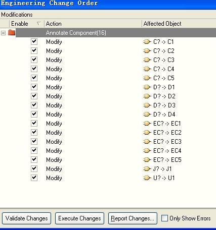 点击 update changes List,更新排序,如果出现重复,有时候会用到 reset Duplicate,或者 reset all,如果用到 Back Annotate,注意原理图与 PCB 元件的 ID 号是否对应,必要时在 PCB 环境下,进行 CompontLink 操作。