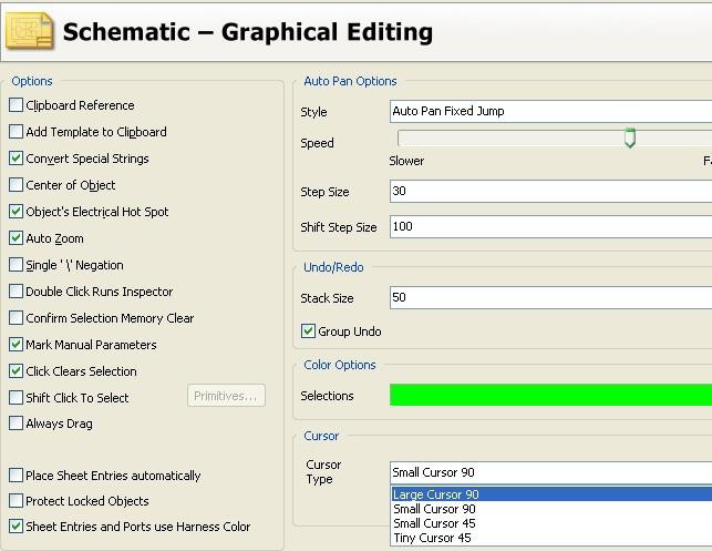 对鼠标显示的设置,Cursor Type 推荐使用 Large Cursor 90,在放置元件时,元件保证在一条直线上。
