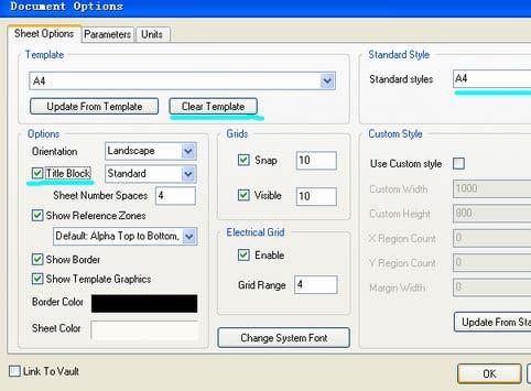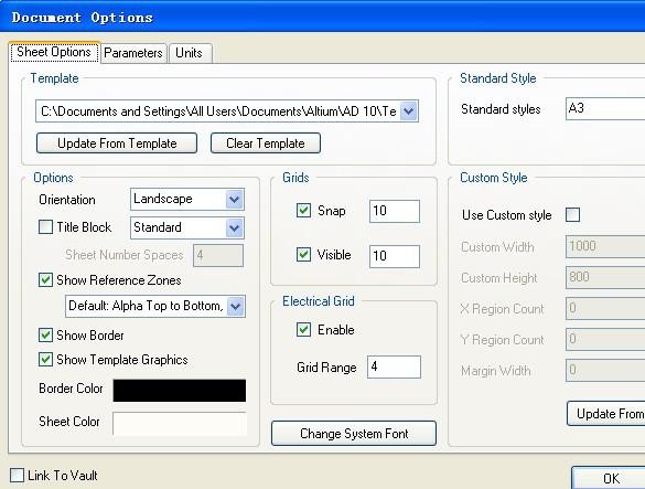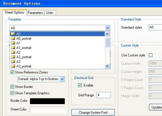 在【Sheet Options】中对【template】中的原理图进行更新,选择你需要的大小,默 认为 A4, 但多说情况下,公司为选择 A3 的做模板。