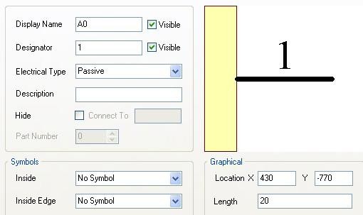 放置外形和管脚快捷键 P+R, 调整合适的小。放置管脚 P+P, 然后单击键盘的 Tab 键弹出管脚属性对话框,修改相应的属性。