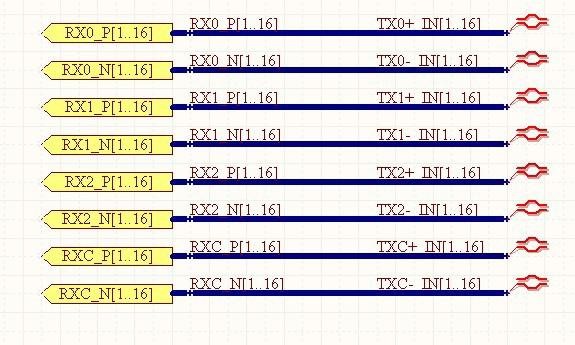 在下面的两幅图中体现了独立的差分对和多对差分对的处理方法。 在差分对中主要是放置 Net 和差分对符号。Net 放置时注意放置 Net 的后缀,“_ P”,"_N", 大小写都可以;另一个是放置差分对标号:【Place】【Driectives】 【Differential Pair】