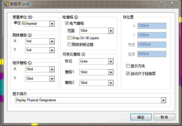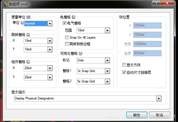 3、可视化栅格(Visible Grid):可视化栅格式独立的跳转栅格。就是背景图中一格的距离,在PCB编辑界面中有两种可视化栅格,再电路板选项 对话框 中设置并单独显示。