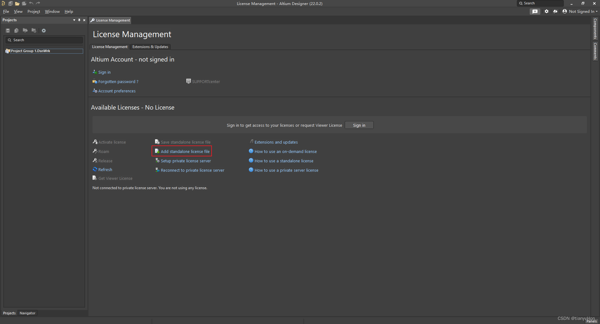 10、打开 Altium Designer,初次打开会出现如下界面,之后点击 Add standalone license file,然后选择河蟹文件夹中的 AltiumDesigner.alf