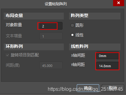我们想要纵向阵列为两排,所以对象数量为2, X 轴间距设置为0,Y轴间距设置为14.8(板子本身尺寸为13mm,加两排连接过孔设置为1.8mm)