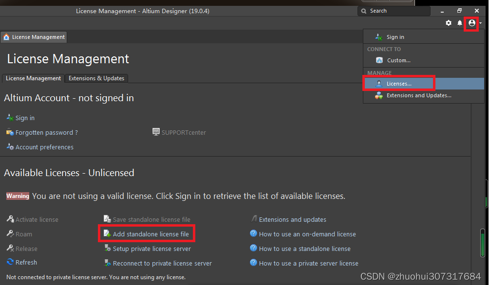 如下图红框所示,点击右上角的小人头图标,再点lic...,就会出现一个界面,再点击这个界面里的“Add standalone linc.. file”,在弹出的对话框里选择.alf文件即可。