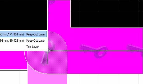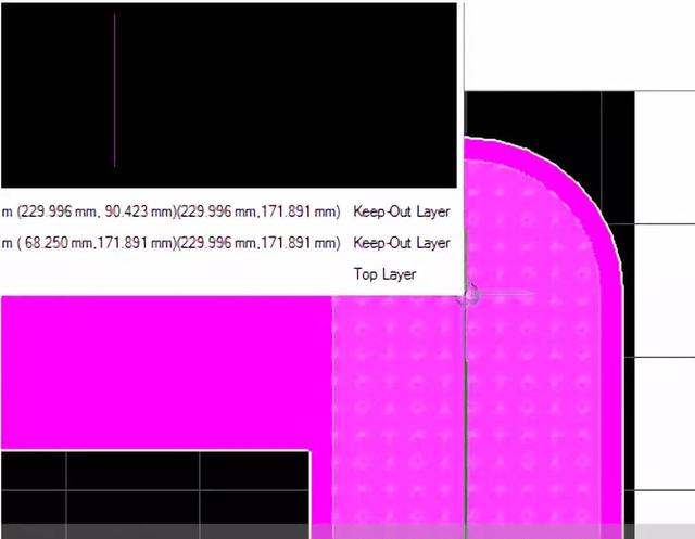 (1)首先使得禁止布线层的线能完整构成一个方框,拐角处如下图所示,两条线的端点要完全一致。