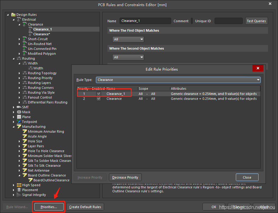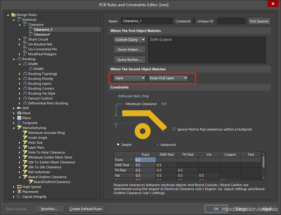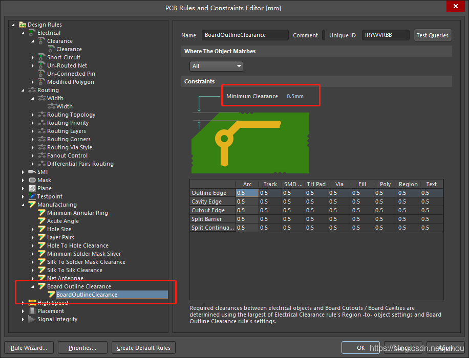进入 Design->Rules->Manufacturing->Board Outline Clearance