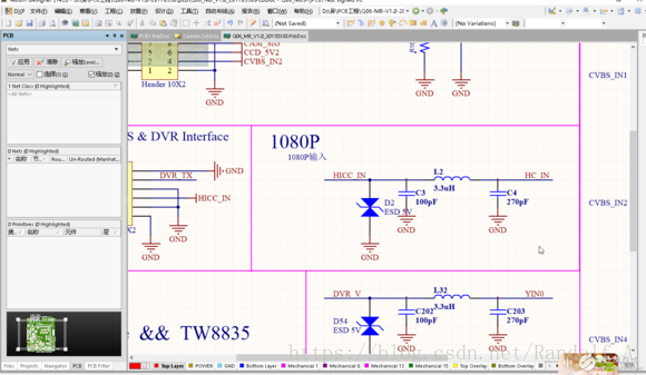 注意看,从原理图界面切换到PCB文件后,显示界面显示的原理图界面,让人感觉PCB文件变透明了。