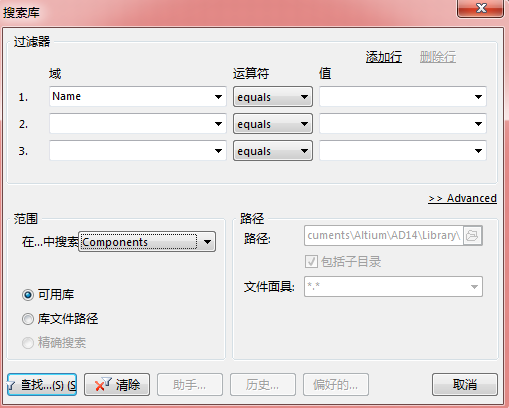 首先,Altium Designer提供了强大的元件搜索能力:“库”面板->Search,弹出搜索库的对话框。