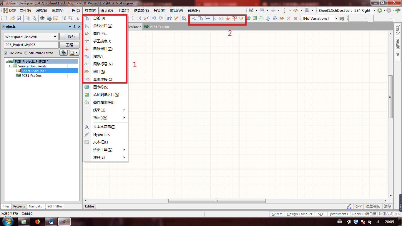 导线是电气连接中最基本的组成单位,放置导线的方法:放置->线,布线工具栏