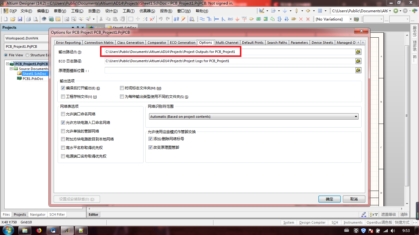 在里面可以设置各种报表(包括网络表)地输出路径,默认是当前文件夹下。