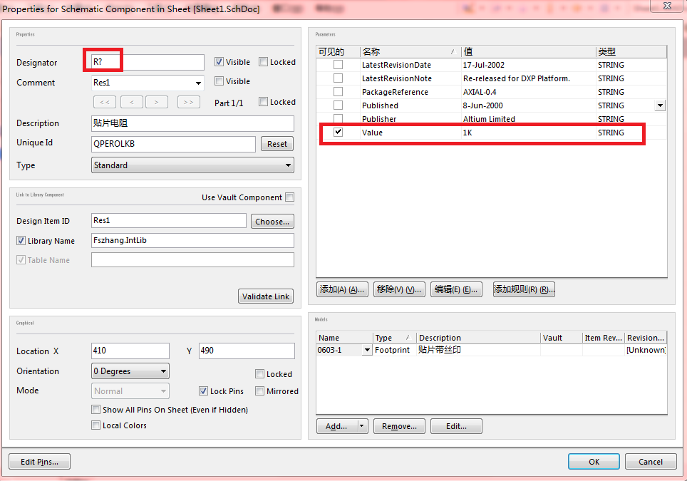例如:放置一个电阻元件,设置它的属性(电阻的编号和电阻值):