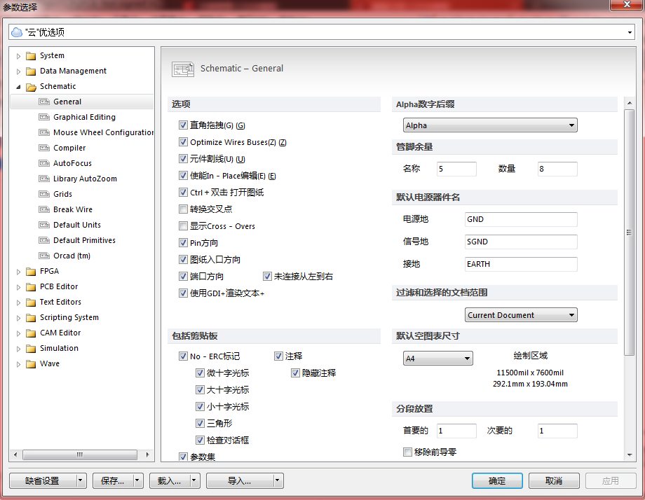 在弹出的窗口中,可以进行常规设置、图形编辑、鼠标滚轮设置、编译器、自动获得焦点、库扩充方式、栅格、断开连线、默认单位、默认图元、端口操作选项卡可以进行设置。