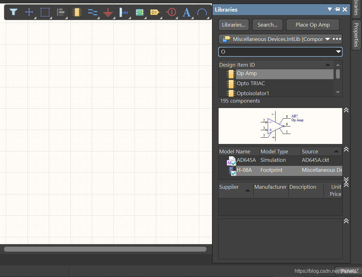 在libraries中找到通用运放Op Amp(OPA211与大多数OP系列运放引脚设置相同),双击 Op Amp 将其放置在原理图中。原理图中双击运放可以打开properties界面。在此侧边栏中修改运放的信息。此处修改为OPA 211.