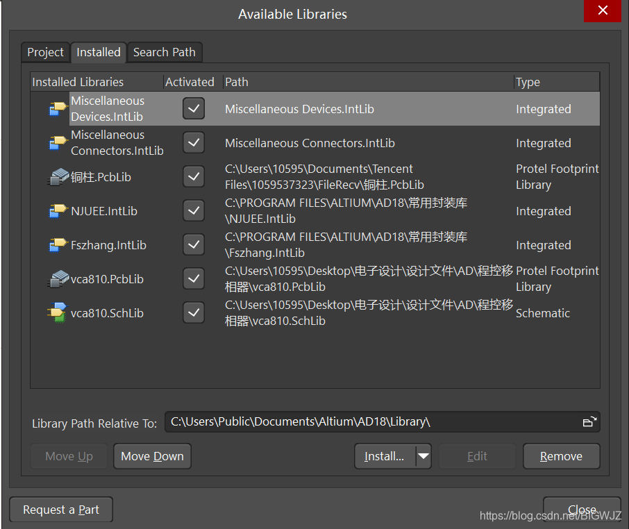 AD的芯片 信息 都保存在库中。我们可以使用现成的库,也可以自己制作一个常用库。点击place part (即下图横栏第五个黄色芯片标志)可以打开Libraries侧边栏。