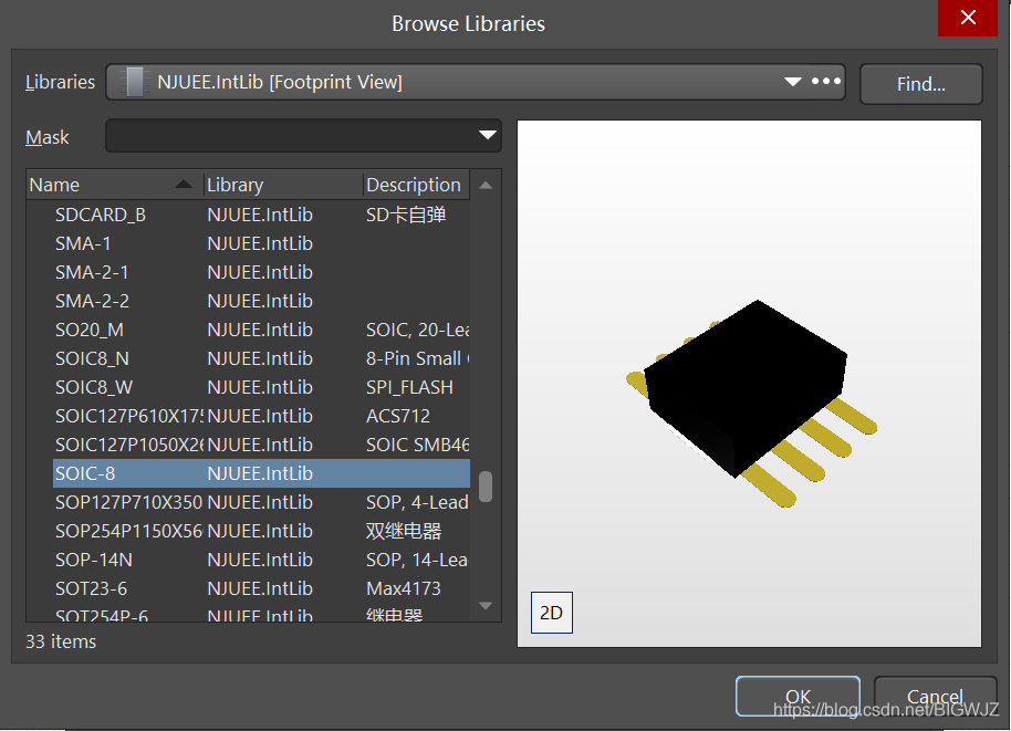 点击之后将又会出现一个弹窗,可以让我们选择封装,我们选择常用的贴片封装SOIC-8,8脚贴片芯片。封装是根据芯片来选择的,常用的有SOIC和DIP,若是不常见的芯片,可以从官网(比如TI)上 下载 对应的封装文件。