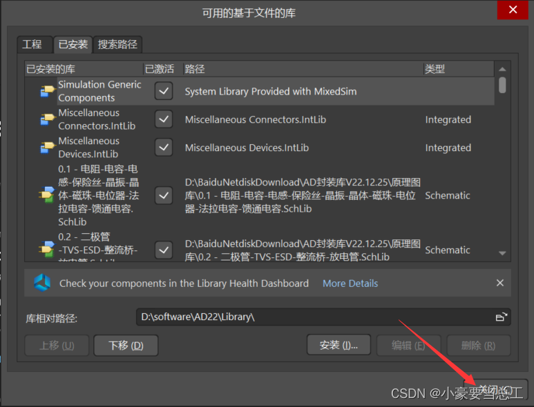 - 重复步骤4和5将PCB封装库1和2安装完成,关闭窗口。