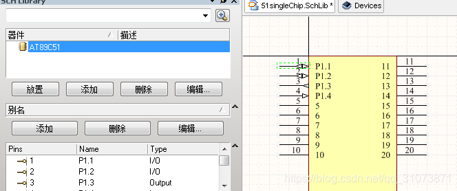 以便显示出原理图库中的器件列表,器件的默认名称为component_1,我们可以双击修改它的名字,例如我把它改成了STC89C51