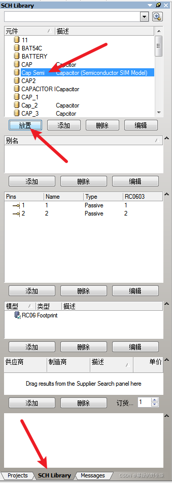 上面是通过搜索元件的方式把元件放进原理图中的,你也可以也直接从原理图库中,找到你想放置的元件,然后点击【放置】,如下图: