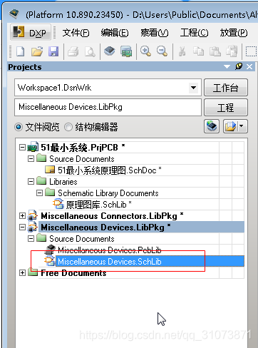因为我们想要从这个库中抽取AD自带的那个排阻,所以我们点击【摘取源文件】。然后这个原理图库就会被添加进我们的工程中,如下图所示,再双击这个原理图库,