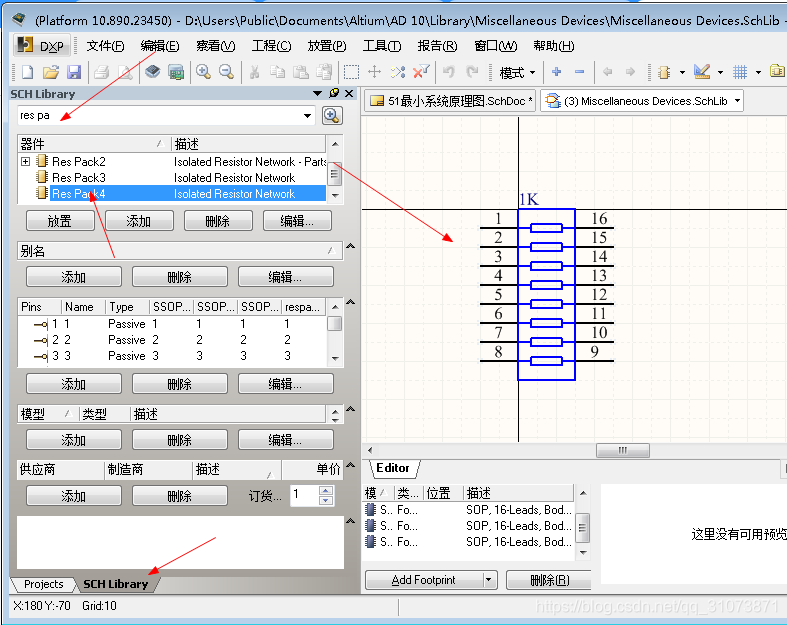 并切换到SCH Library选项卡,如下图所示。搜索并选中,然后选中排阻原理图,ctrl c复制它。
