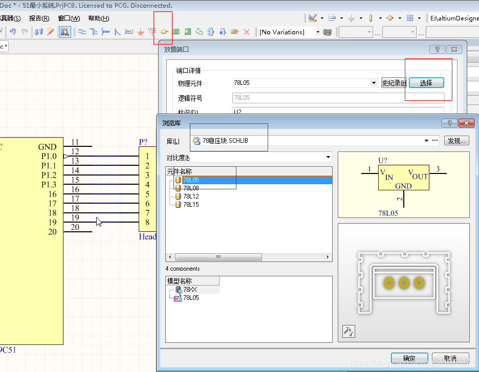 继续向原理图中摆放我们刚下载的这些元器件,例如 78L稳压电源、各种电阻、电容、电源等: