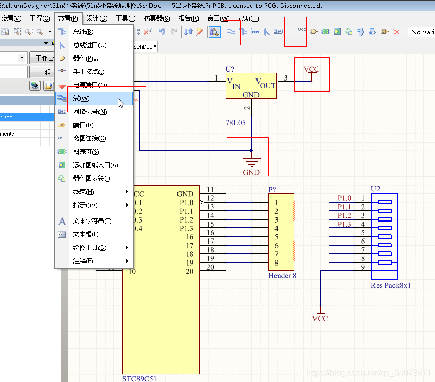 把元件都摆放好以后,然后放置电线(快捷键P W, Place Wire),把所有的元器件用电线连起来,如下图的 P1 .0和排座Header 8 相连。